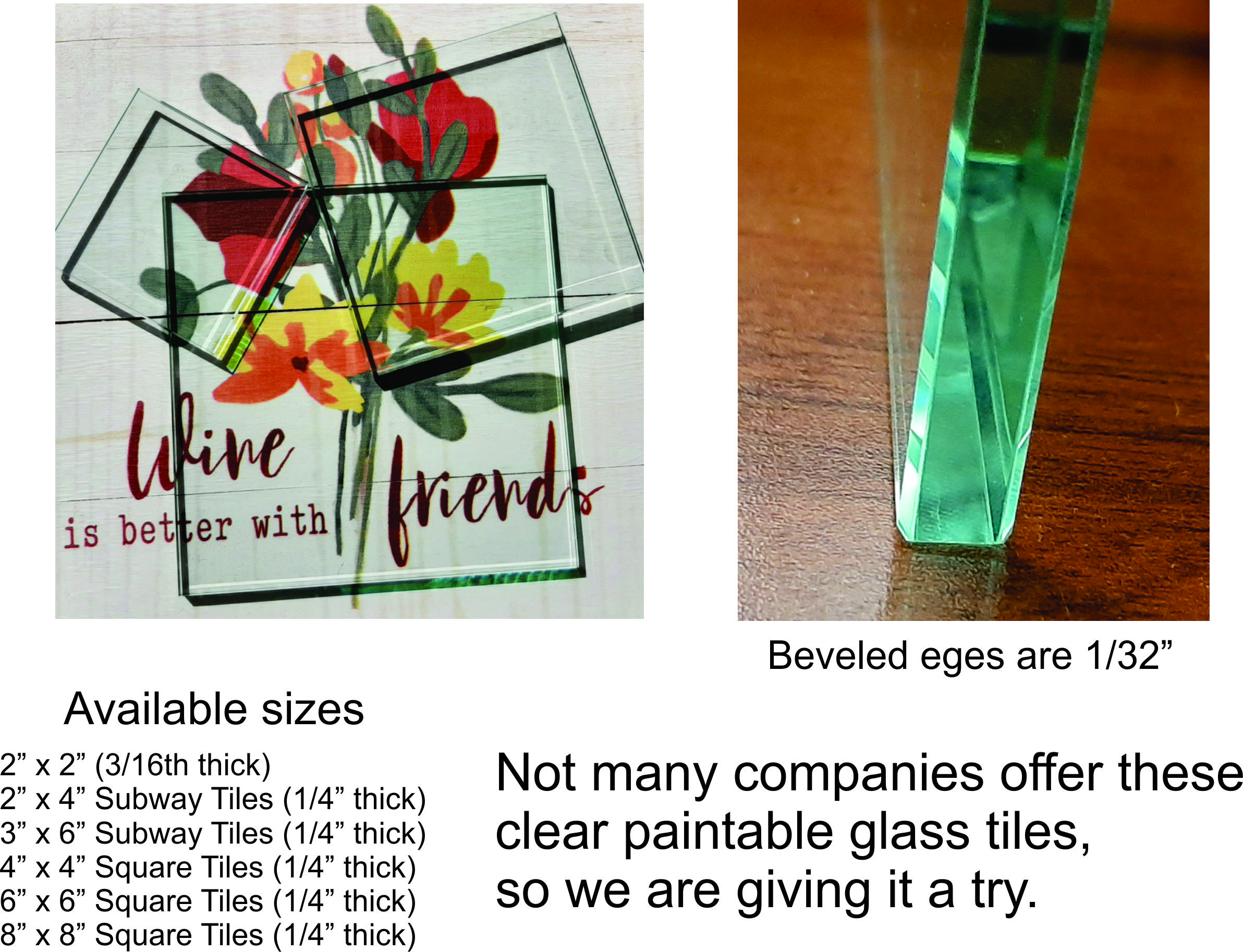 Clear Glass Beveled Tiles for back-painting glass for Kitchens and Baths, or any room in your home. Many sizes for the person who loves doing custom tile work.