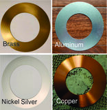 The inside round opening (I.D.) is 4 inches, and the overall outer measurement (O.D.) at 7.5" inches is our standard size. Also available in 4.5" (I.D.) by 7.5" (O.D.). The Finishing Rings are also available in our 38 custom finishes for an additional charge. Available in Brass now for $57.88. However there is an extra charge for each ring with a custom Pewter finish and a minimum order of 20 rings, which need additional plating and refinishing required other than the standard brass, aluminum, and nickel silver standard finishes. This does include all shipping charges, and there are three of them we have to do. One to our factory, one to the finishing company, and one back to the customer.