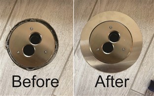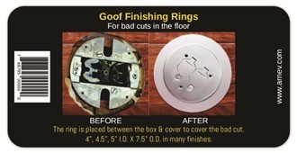 You hired a contractor to put in some electrical outlets on your new hardwood floor. However, when the contractor cut the hole in the floor the floor box cover was not large enough to cover up the rough edges they left on your beautiful new floor! What do you do? Or how do you cover up an existing concrete floor box in the floor where the tile is all cracked and chipped? We have the solution for you with our Goof Rings for floor box covers.